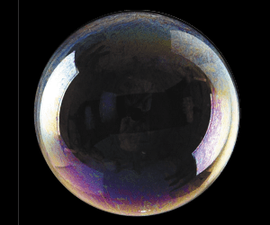 A soap bubble is a very thin film of soap water that forms a hollow sphere with an iridescent surface. A bubble can exist because the surface layer of a liquid (usually water) has a certain surface tension, which causes the layer to behave somewhat like an elastic sheet.